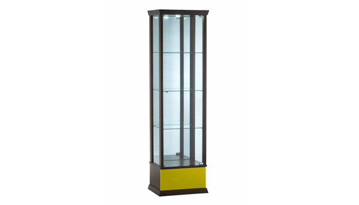 estrutura em MDP e MDF laminado em madeira, espelho nas costas, vidro 5mm nas prateleiras, 4mm nas laterais e 6mm nas portas .